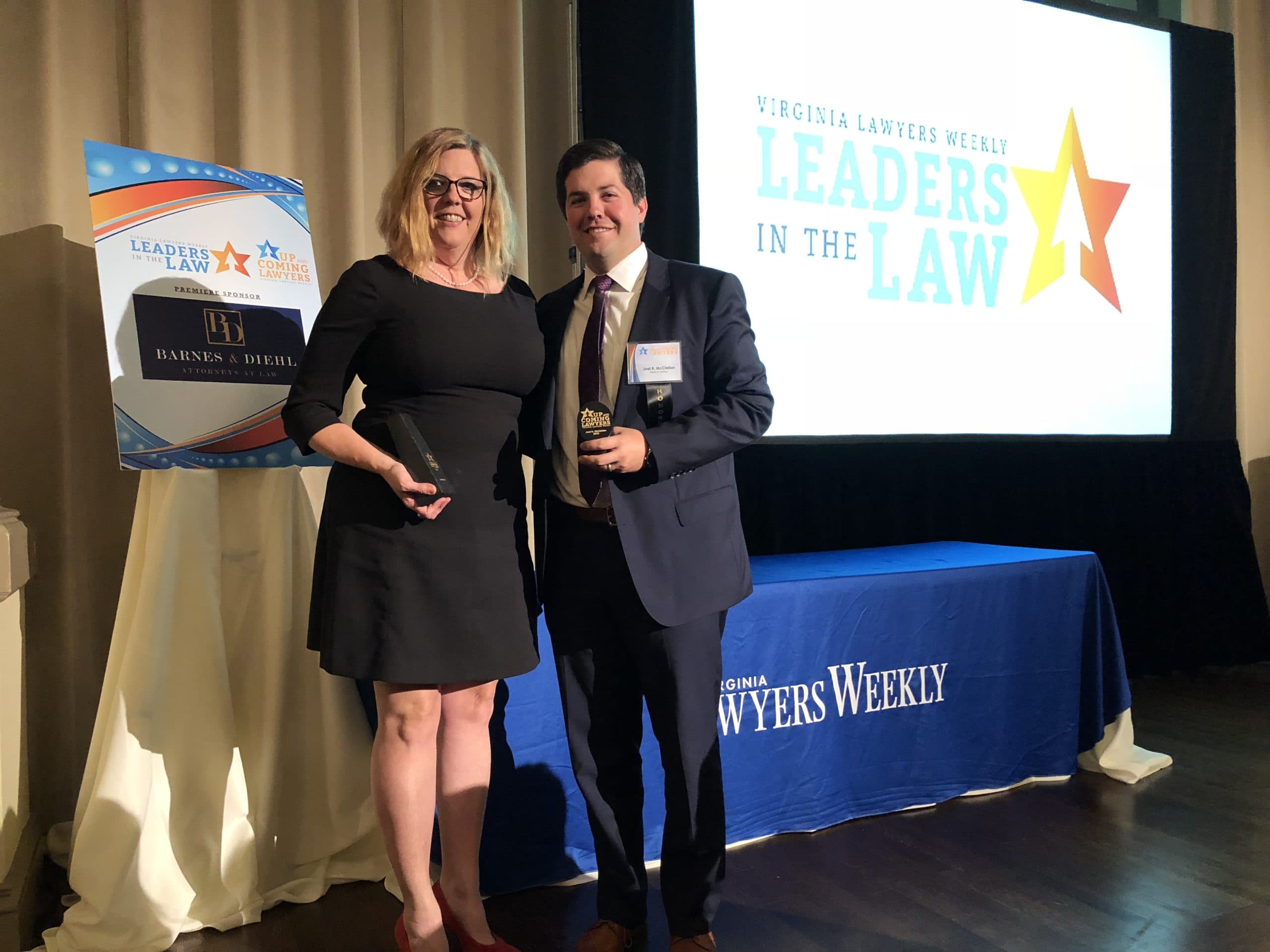 Attorneys Joanna Suyes and Joel McClellan were honored by Virginia Lawyers Weekly at an event in Richmond on October 25, 2018. The event honors Leaders in the Law and Up & Coming Lawyers across the state.