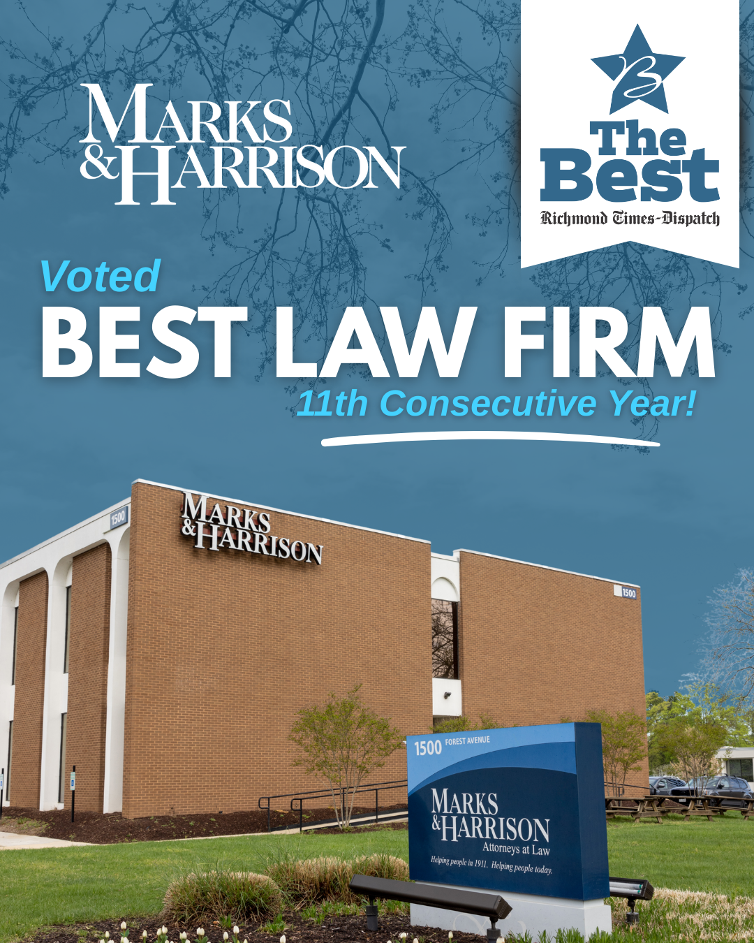 The votes are in, and Marks & Harrison is profoundly honored to announce that we have been named the Best Law Firm in the Richmond Times-Dispatch “The Best” contest for an unprecedented 11th year in a row!
