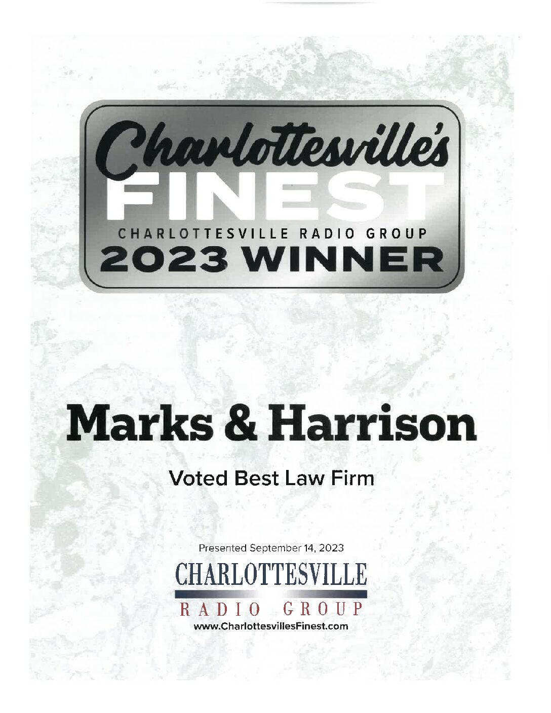 Charlottesville Radio Group has named Marks & Harrison Charlottesville’s Finest in the category, Best Personal Injury Lawyer.