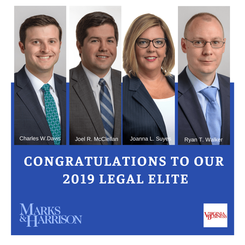 Marks & Harrison is proud to announce that four of our attorneys were chosen as members of the 2019 Legal Elite by Virginia Business. Each year Virginia Business Magazine, in partnership with the Virginia State Bar, holds its Legal Elite nominations project. Legal Elite recognizes the top lawyers in the state of Virginia across 18 […]